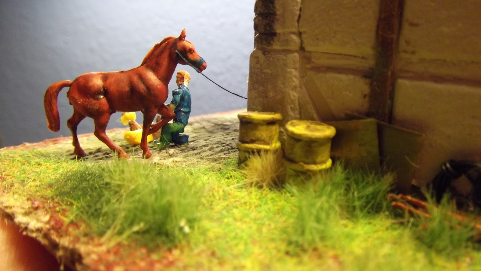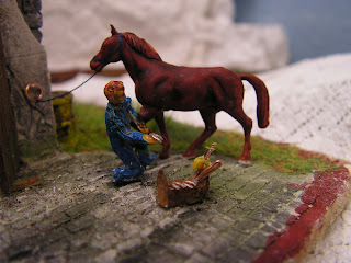 | huset er indrettet som en smedje, smeden har en hest til skoning |