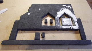 | huset er skåret ud i 1 cm tyk liggeunderlag,sat fast med lidt dobbelt klæbene tape på et stykke masonit, der efter fyldt med gips |