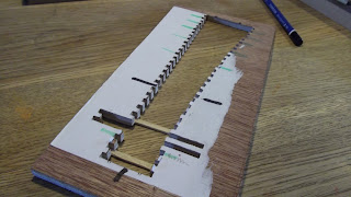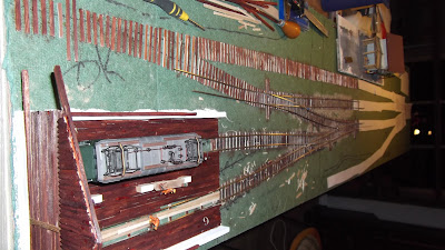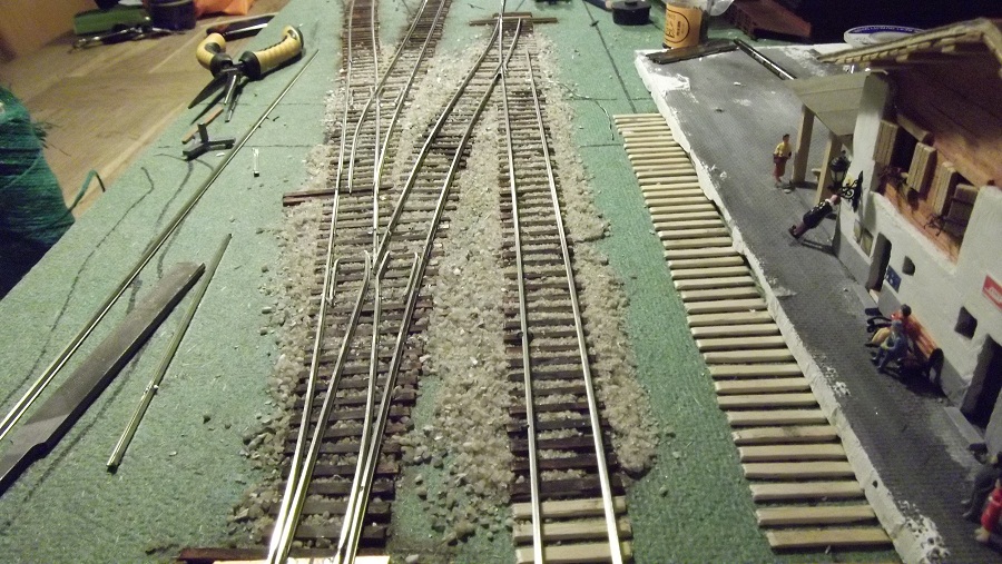 jeg er gået igang med 2 moduler 40 x 95 cm, der skal indeholde en station, spor har jeg efter en prøvebygning af et sporskifte, besluttet at jeg vil bygge selv. skinnestrenge code 100 er blevet indkøbt, ispinde er købt, ikke spist, skåret op i sveller, diverse skabeloner til lægning af sporskift lavet, så endelig til det sjove, få bygget noget spor, her er et video klip af det første stykke.