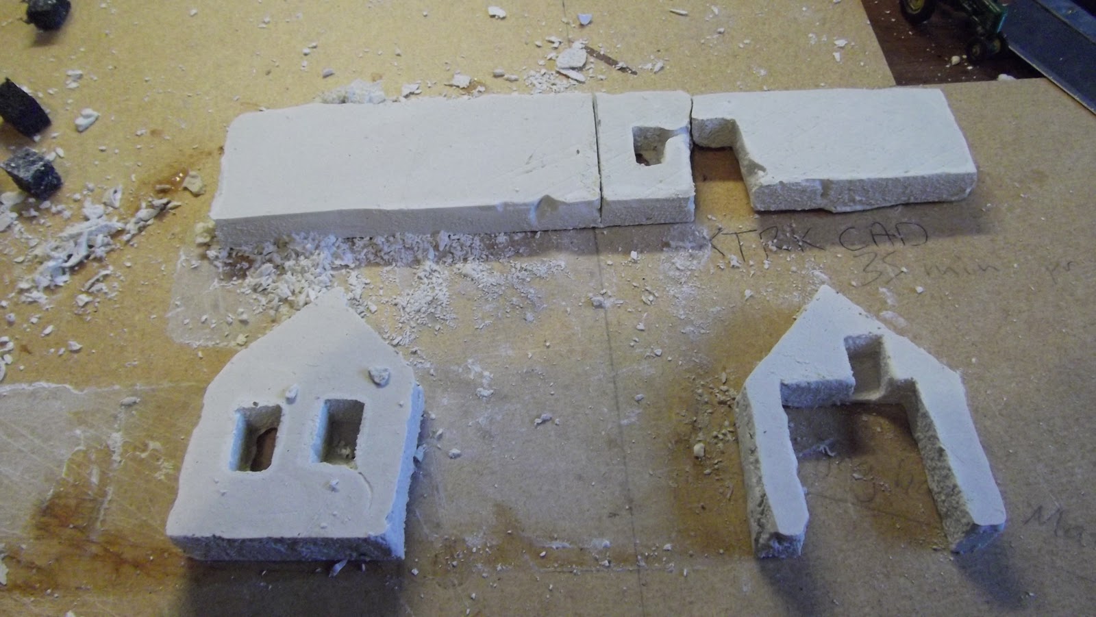 | huset er skåret ud i 1 cm tyk liggeunderlag,sat fast med lidt dobbelt klæbene tape på et stykke masonit, der efter fyldt med gips |